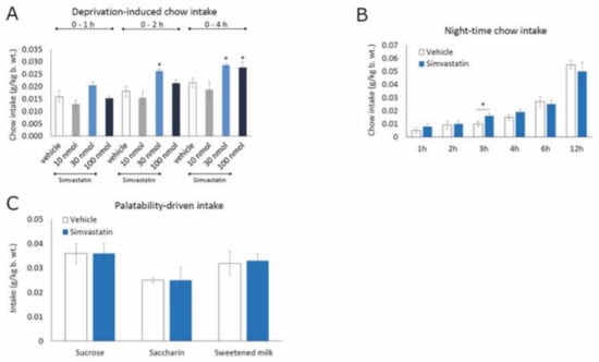 Next, using rats, we looked further into the effect of downregulating hypothalamic Hmgcr activity on food intake. ICV administration of simvastatin at 30 and 100 nmol significantly increased standard chow intake following overnight food deprivation (Figure 7A). Similar to mice, a moderate and transient increase in food consumption also occurred at 3 h post-injection in ad libitum-fed rats (Figure 7B). On the other hand, ICV simvastatin had no effect on food palatability-driven intake. We gave non-deprived ani-mals episodic access to palatable 0.1% saccharin, 10% sucrose or milk solutions (i.e., a non-carbohydrate sweet tastant, a sweet carbohydrate and a nutritionally complex palatable tastant—all of them being either devoid of energy or energy-dilute) and saw no effect of simvastatin on consumption stimulated by pleasant taste (Figure 7C).