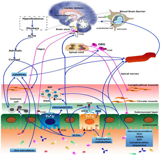 Legend: NTS, nucleus of the solitary tract; NVG, nodose vagal ganglion; FFAR, free fatty acid receptor; DRG, dorsal root ganglion; MP, myenteric plexus, IPAN, intrinsic primary afferent neurons, SMP, submucosal plexus, EEC, enteroendocrine cell; EC, enterochromaffin cells, SCFA, short chain fatty acid [13].
