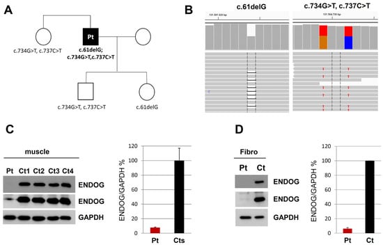 Genetic and protein studies on ENDOG. (A) Pedigree of the patient’s family, with segregation analysis of the ENDOG variants. (B) Snapshots from IGV software (Version 2.3.72) of the ENDOG variants identified in the proband. The changes c.734G > T and c.737C > T were always present on the same reads, indicating they are on the same allele. (C) Western blot analysis of ENDOG in skeletal muscle lysates from control individuals (Ct) and the patient described in the manuscript (Pt). Two different exposure times were used for the ENDOG antibody (shorter exposure in the upper panel, longer exposure in the middle panel). GAPDH (lower panel) was used as a loading control, and for normalization of the ENDOG amount. Error bars indicate standard deviation. (D) Western blot analysis of ENDOG in fibroblasts from a control individual (Ct) and the patient (Pt). Two different exposure times were used for the ENDOG antibody (shorter exposure in the upper panel, longer exposure in the middle panel). GAPDH (lower panel) was used as a loading control, and for normalization of the ENDOG amount. Error bars indicate standard deviation.