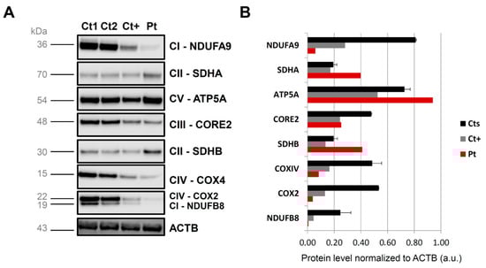 Steady-state levels of OXPHOS complex subunits. (A) Western blot analysis of OXPHOS subunits in skeletal muscle lysates from control individuals (Cts), a patient harboring biallelic C1QBP mutations (Ct+) and the patient described in the manuscript (Pt). OXPHOS subunit-specific antibodies were used against NDUFB8 or NDUFA9 (CI); SDHA or SDHB (CII); UQCRC2 (CIII); COXII or COXIV (CIV); and ATP5A (CV). Cytosolic b-actin (ACTB) was used as a loading control. (B) Graph reporting protein level normalized to ACTB (in percentage, 100% being the mean value of controls), for the Western blot depicted in panel A.