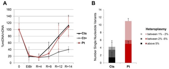 Functional studies on the patient’s fibroblasts. (A) Depletion/repopulation experiment in fibroblasts from the patient (Pt), a control individual (Ct) and a patient harboring biallelic RNASEH1 mutations (Ct+). Depletion was achieved with the addition of EtBr to the culture medium for 4 days (EtBr), and recovery was followed up for 14 days (R + 14) after the removal of the drug. The percentage of mtDNA/nDNA was determined by qPCR; for each subject, an initial value was set up to 100%, before starting treatment (0). (B) Number of heteroplasmic variants detected by NGS in whole mtDNA from the patient (Pt) and control individuals (Ct). Three different ranges of heteroplasmy were considered: above 5%, between 2 and 5%, between 1 and 2%.