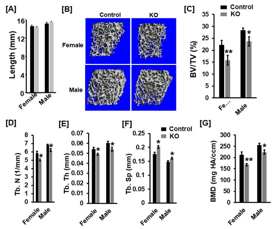 Body weight and body length were not changed in 13-week-old Tspan3 KO mice compared to gender-matched control mice (data not shown). Femur length was not significantly different in either male or female Tspan3 KO mice at 13 weeks of age compared to corresponding gender-matched control heterozygous littermates (Figure 1A). Micro-CT analyses found that trabecular bone volume adjusted for tissue volume (BV/TV) was reduced by 29% and 17% in the femur of Tspan3 KO female and male mice, respectively (Figure 1B,C). The reduced trabecular bone volume of the femur was due to the 14% and 9% reduction in trabecular number and 10% and 11% decrease in thickness, resulting in a 15% and 9% increase in trabecular separation in female and male KO mice, respectively (Figure 1D–F). The trabecular volumetric bone mineral density (BMD) was decreased by 21% and 12% in the femur of Tspan3 female and male KO mice, respectively, compared to corresponding control mice (Figure 1G). The trabecular parameters exhibited similar changes in the tibia of Tspan3 KO mice as those of the femur. The trabecular BV/TV of the tibia was 20% less in both Tspan3 KO female and male mice compared to control mice (Figure 2A). In agreement with the bone mass of the femur, the decrease in trabecular bone mass of the tibia of Tspan3 KO female and male mice was caused by 12% and 8% decreases in trabecular number and thickness, respectively, and a 10%–15% increase in trabecular separation (Figure 2B–D). Total volumetric BMD is reduced by 12% and 14% in the tibia of Tspan3 KO female and male mice, respectively (Figure 2E). Analysis of data for gender differences revealed no significant gender difference in the trabecular bone parameters of Tspan3 KO mice.