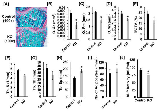 Figure 3. Reduced bone formation in Tspan3 KO male mice. Bone sections were stained with trichrome and the histomorphometry of the trabecular bone of the secondary spongiosa of the tibia was analyzed. (A) Representative images of longitudinal sections of the proximal tibial metaphysis, stained with trichome blue and Safranin Orange. (BH) Quantitative histomorphometry data of the trabecular bone of the proximal tibial metaphysis. O. Ar, osteoid area; O. Pm, osteoid perimeter; O. Wi, osteoid width; TV, tissue volume; BV, bone volume; Tb. N, trabecular number; Tb. Th, trabecular thickness; Tb. Sp, trabecular spacing; Values are Mean ± SEM (n = 7–9). (I) Number of adipocytes in tibial bone marrow section. (J) Serum alkaline phosphatase (ALP) activity. *: p < 0.05 as compared to the control littermates.