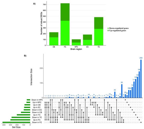 (A) Number of down and up-regulated robust genes in each brain region; (B) upset plot indicates the overlap of robust differentially expressed genes with either increased or decreased abundance in different brain regions; DEGs, differentially expressed genes; CB, cerebellum; FC, frontal cortex; HPC, hippocampus; EC, entorhinal cortex; TC, temporal cortex.