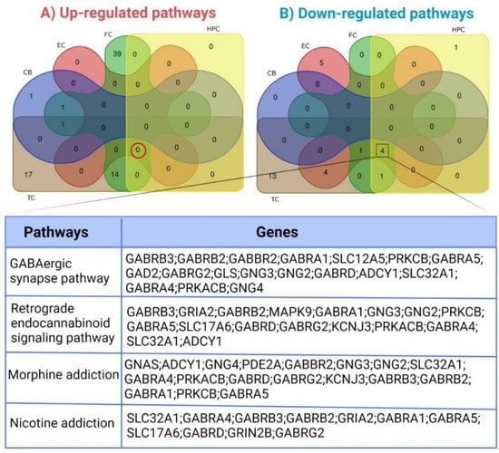 Venn diagram of KEGG pathway enrichment analysis on (A) Up-regulated and (B) Down-regulated pathways based on adjusted p-value. TC, temporal cortex; FC, frontal cortex; EC, entorhinal cortex; HPC, hippocampus; CB, cerebellum.