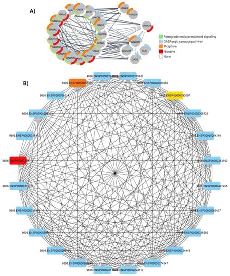 Functional interaction networks analyzed by the String Cytoscape plug-in. (A) PPI network of genes related to GABAergic synapse pathway (red), retrograde endocannabinoid signaling (green), morphine (blue) and nicotine (orange). (B) In addiction, PRKACB (red), PRKCB (orange) and GABRA1 (yellow) found the top hub genes based on the MCC algorithm.