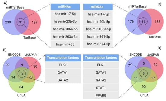 Transcription factors and miRNAs analyses. (A,B) results represent Venn diagram analysis for the top five miRNAs and the three TFs that interact with the robust DEGs of the GABAergic synapse pathway. (C,D) show Venn diagram analysis and the top five miRNAs and the TFs interacting with the robust DEGs involved in retrograde endocannabinoid signaling.