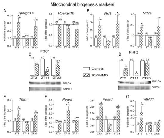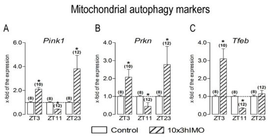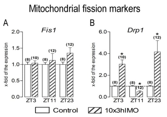 13], the mechanisms are not described yet. Here, we hypothesize that psychophysical stress causes different changes in mitochondrial dynamics and functionality markers, as well as related signaling molecules, depending on the circadian time of the stress exposure. The effects of the repeated stress were followed at different time points during the day (light/inactive and dark/active phase): ZT3—3 h of stress started at 7 a.m. (ZT0, lights on) and finished at 10 a.m.; ZT11—3 h of stress started at 3 p.m. (ZT8) and finished at 6 p.m.; ZT23—3 h of stress started the next day at 3 a.m. (ZT20) and finished at 6 p.m. (please see