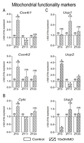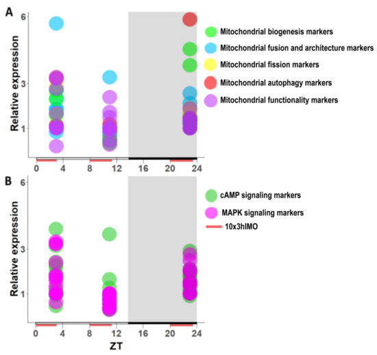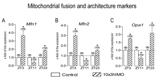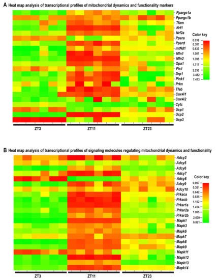 Ucp2) had a circadian-like pattern of transcription, which implies significantly increased expression at ZT3, significantly (or insignificantly) decreased expression at ZT11, and significantly increased expression at ZT23. Most exceptions from this circadian pattern occurred among the mitochondrial functionality markers, while the transcription of mitofusion/architecture markers was the most consistent followed by the highest fold of change (