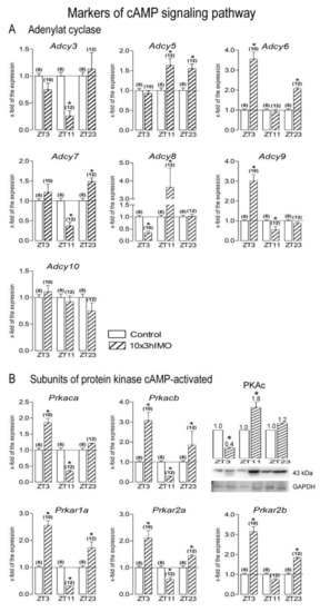 Figure 13) that the transcription of most of the markers significantly increased (7 out of 12 cAMP signaling markers; 8 out of 10 MAPK signaling markers) at ZT3 (3 h after stress). At ZT3, the opposite pattern was observed: only levels of transcripts for