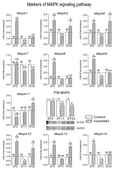 Prkaca, had the same time-dependent profile (increased transcription at ZT3 and ZT23). Most of the followed markers of the MAPK signaling pathway (