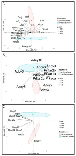 Figure 12) show the significant separation of the effects of repeated stress on mitochondrial dynamics markers, cAMP signaling pathway elements, and MAPK signaling pathway elements depending on the day phase. PCA confirmed that the transcriptional patterns were different during active and inactive phases with clear “separation” of