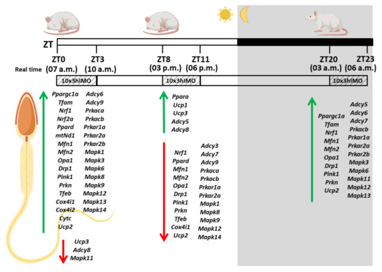Figure 1; ZT—zeitgeber (time giver)). Our intention was not to study spermatogenesis but only the patterns of the transcriptional profile of mitochondrial dynamics markers as well as markers of signaling pathways (cAMP and MAPK signaling) related to the regulation of both mitochondrial dynamics and spermatozoal functionality. We believe that this approach will reveal the pattern of molecular adaptation of spermatozoa and help in the development of new molecular markers for the assessment of male (in/sub)fertility.