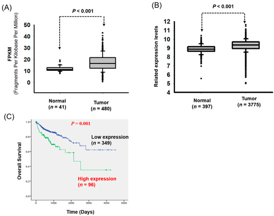 High LOC550643 expression was correlated with poor prognosis in patients with CRC. LOC550643 expression level were examined through the analysis of (A) The Cancer Genome Atlas (TCGA) database and (B) the Gene Expression database of Normal and Tumor tissues (GENT). (C) Kaplan–Meier analysis revealed the association of high LOC550643 expression and poor survival in patients with CRC.