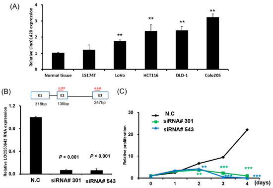 Biological role of LOC550643 in colon cancer cells. (A) LOC550643 expression was assessed in five colon cancer cell lines and corresponding histologically normal tissues through real-time polymerase chain reaction (PCR). The normal tissue samples were obtained from five patients with CRC. (B) LOC550643 expression levels were examined in HCT116 cells transfected with two siRNAs (siRNA#301 and siRNA#543). (C) The cell proliferation assay was conducted on HCT116 cells following their transfection with siLOC550643-#301, siLOC550643-#543, or a scrambled control (** p < 0.01, *** p < 0.001).