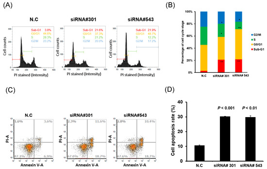 LOC550643 knockdown hindered cell cycle progression and induced apoptosis in colon cancer cells. LOC550643 was knocked down in HCT116 cells through transfection with siRNA-#301, siRNA-#543, or N.C (scrambled control) control. (A) Cells in each phase of the cell cycle were analyzed through flow cytometry. (B) Cell populations in each phase were quantified using NucleoView NC-3000 software. (C) After LOC550643 knockdown for 48 h, cell apoptosis was detected through the annexin V assay. (D) The number of apoptotic cells in HCT116 cells with LOC550643 knockdown and in control cells was quantified (N.C group). Experiments were performed in triplicate, and data were analyzed using the student t test. Differences were considered significant at p < 0.05 (* p < 0.05, ** p < 0.01).