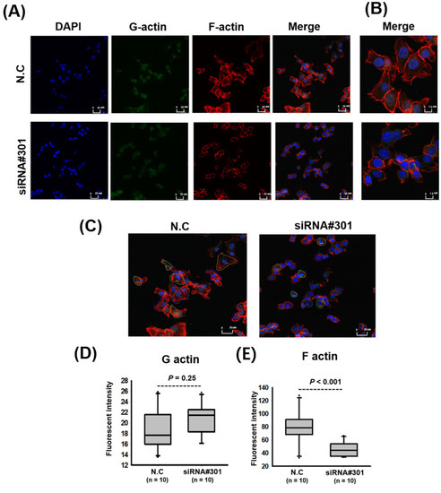 LOC550643 knockdown modulated G-actin and F-actin polymerization to inhibit colon cancer cell motility. (A) After LOC550643 knockdown, F-actin and G-actin were stained with rhodamine phalloidin and Alexa Fluor 488, respectively. The fluorescence intensity of HCT116 cells was determined through confocal microscopy (magnification 40×). (B) Images of F-actin (red), G-actin (green), and nuclei (blue) were merged, revealing that HCT116 cells with LOC550643 knockdown exhibited fewer filopodium fibers than did normal HCT116 cells (magnification 100×). (C–E) Fluorescence intensities of G-actin and F-actin were calculated through confocal microscopy (n = 10).