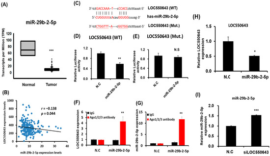 LOC550643 sponged miR-29b-2-5p expression through direct interaction. (A) MiR-29b-2-5p expression was examined in CRC cells through the analysis of the TCGA database. (B) The relationship between LOC550643 and miR-29b-2-5p in CRC cells was assessed through Pearson correlation analysis. (C) Reporter construct sequences with wild-type LOC550643 or a binding site mutant is presented. (D,E) After miR-29b-2-5p cotransfection with pMIR-REPROT-LOC550643 or pMIR-REPROT-LOC550643(mutant) into colon cancer cells, relative luciferase activity was assessed. Firefly luciferase activity served as a normalization control. (F,G) HCT116 cells were used to perform Ago2 protein precipitation, and the expression levels of miR-29b-2-5p and LOC550643 were examined using real-time PCR. (H) Endogenous LOC550643 expression was examined in HCT116 cells transfected with miR-29b-2-5p mimics. (I) Endogenous miR-29b-2-5p expression was assessed in HCT116 cells with LOC550643 knockdown (* p < 0.05, ** p < 0.01, *** p < 0.001).