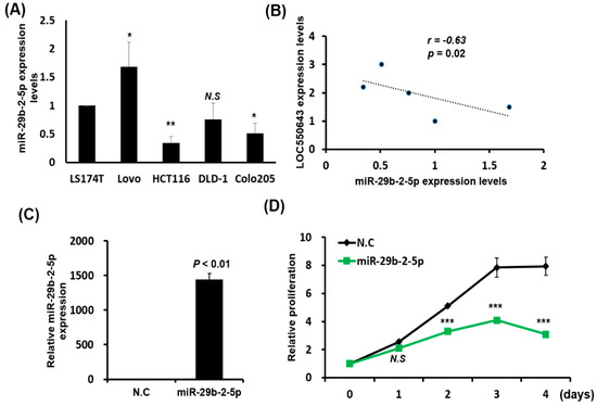 Both miRNAs and lncRNAs play integral roles in regulatory gene expression and are involved in pathophysiological processes in CRC [6,36]. Studies have revealed that lncRNA modulates the growth and metastasis of colon cancer cells by sponging miRNAs or by influencing the miRNA maturation process [7,36,37]. Yu et al. reported on a novel mechanism of the interaction of CCAT2 with pre-miR-145 in the cell nucleus, which results in the suppression of the pre-miR-145 maturation process [37]. Most relevant studies have indicated that the lncRNA–miRNA interaction occurs in the cytoplasm, leading to the segregation of miRNA and the inhibition of miRNA–RNA interaction [38,39]. LOC550643 is predominantly expressed in the cytoplasm, and therefore an interaction between LOC550643 and miR-29b-2-5p may be crucial in the regulation of growth and metastasis in colon cancer cells. The miR-29 family is related to numerous diseases and implicated in tumorigenesis [40]. Notably, miR-29 can induce the epithelial–mesenchymal transition in breast and colon cancer, which may play essential roles in different stages of cancer [40]. Inoue et al. demonstrated that miR-29b expression was significantly reduced in CRC cells compared with in normal mucosa. They suggested that low miR-29b expression acted as a poor prognostic biomarker for pathological T stage, metastasis, and overall survival in patients with CRC [41]. Recent studies have indicated that miR-29b expression inhibits cell viability and stimulates cell apoptosis in human cancers, including colon cancer, through the suppression of FOLR1 expression [42,43]. The biological role of miR-29b might involve tumor suppression during colon cancer progression.