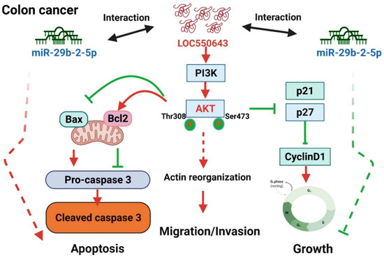 In summary, our current results revealed a novel mechanism that LOC550643 plays an oncogenic role in colon cancer growth and apoptosis through regulating the PI3K signaling pathway and decoying miR-29b-2-5p function (Figure 9). These findings provided valuable insight into the novel oncogenic role of LOC550643, which can serve as a useful prognostic biomarker and therapeutic target in patients with colon cancer.