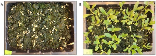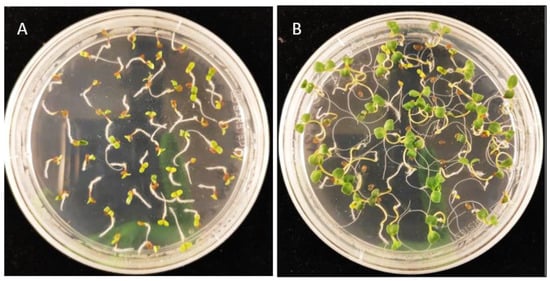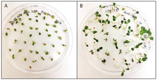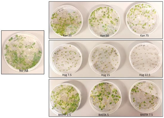 In the case of in vitro selection, both hygromycin at 22.5 mg/L and BASTA at 15 mg/L showed a clear difference between WT and segregating positive transformant populations after 14 days of growth, as can be observed in Figure 4 and Figure 5. Screening large quantities of floral dipped T1 seeds was also tested on MS plates with Hyg or BASTA. Due to the large number of seeds, the sterilisation method was important to obtaining optimal results. We found that liquid sterilisation by washing with bleach solutions was effective to sterilize small seed batches of around 50–100 seeds but resulted in too much contamination when sterilising in bulk for primary transformant selection. Instead, dry sterilisation with chlorine gas was a more effective way to simultaneously sterilise larger seed batches. It was important to maximise the spreading of the seeds across a larger surface area to allow sufficient penetration of the chlorine gas between the seeds. The optimised concentrations of Hyg at 22.5 mg/L and BASTA at 15 mg/L were successful in identifying primary transformants among T1 dipped seeds.
