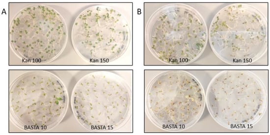 Kanamycin (Kan) and BASTA selection at higher doses. Selection of transgenic Camelina grown in vitro on MS media plates containing variable concentrations of antibiotic. Doses are expressed in mg/L. Picture taken after (A) 20 days growth, or (B) 30 days growth.