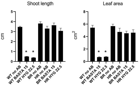 Antibiotic effects on shoot length and leaf area. For both graphs the first three columns correspond to WT Camelina grown in vitro with no antibiotics, BASTA 15 mg/L or Hygromycin 22.5/mg, respectively. Next, BR (BASTA-resistant) and HR (Hyg-resistant) plants grown with no antibiotics, followed by BR and HR lines grown on the antibiotic they carry resistance for. Measurements were performed using 14-day-old seedlings. Error bars indicate Standard Error. Statistical significance was calculated using Student’s t-test comparing each treatment with WT no AB. Only treatments with (*) showed significant difference (p-value < 0.05).