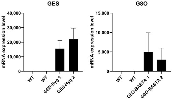 Basta- or Hyg-resistant plants were subsequently tested for transgene expression by qRT-PCR. The house keeping gene ACT2 showed a consistent expression in WT Camelina as well as for positive transformants, with CT values around 22 to 23 cycles. As the selected GES and G8O are not endogenously expressed in Camelina, the wild type plants showed no specific amplification of the qRT-PCR products, so the CT value was set to 40 and their expression fold considered as 1× (Figure 7). In contrast, the selected Hyg-resistant plants showed high relative transcript abundance for GES, with CT values around 25 cycles, while Basta-resistant plants showed high transcript levels for G8O, with CT values around 28 cycles (Figure 7). We also tried floral dipping followed by Kan-based selection using the pK7WG2 vector (containing G8O). However, as observed above, no clear counter-selection of wild type plants could be achieved, and no clear Kan resistant T1 plants could be identified. In summary, these findings show that overexpression of transgenes can be achieved in Camelina using Hyg and BASTA-based selection.