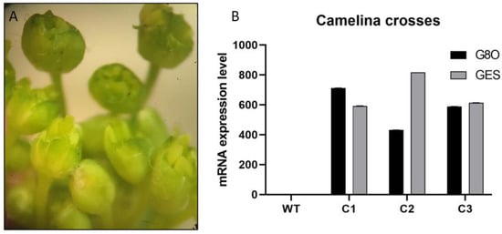 Genetic engineering of metabolic pathways often involves the introduction of multiple genes to build a complete pathway. Furthermore, engineering of multiple pathways which have at least partially common enzymatic steps could be desired. Therefore, it can be useful to genetically combine transgenes expressed in different lines by crossing the parental lines. Since BASTA selection is the easiest in Camelina, we attempted to produce Camelina lines carrying both GES and G8O enzymes by crossing GES Hyg-resistant plants as the female, with pollen from G8O BASTA-resistant plants. We could not find clear protocols for crossing Camelina in the literature, so we initially attempted crossing Camelina with a similar method we normally use to cross Arabidopsis (by pollinating flowers that were not opened, but from which the stigma was just emerging from the closed sepals/petals, with pollen from a mature and fully opened donor flower). This crossing method was performed several times but was, however, not successful, with no seeds coming from the crossed female flower surviving BASTA selection. Therefore, we tried a different strategy: emasculating the acceptor flower buds leaving the unpollinated style exposed and undamaged (Figure 8A). This emasculation was performed using fine sharp tweezers under a dissection microscope. The emasculated buds were pollinated with pollen from mature BASTA resistant flowers, and the surrounding unpollinated buds were removed from the acceptor plant. From a total of 40 buds, 20 continued developing healthily and produced around five to eight seeds per bud, after being emasculated and pollinated (Figure 8A). All the seeds were sown in soil and later sprayed with 100 mg/L BASTA, which is the resistance gene inherited from the male parental side, to verify the crossing was successful. Fifteen plants survived the BASTA selection and were then transferred to new pots. These plants were subsequently tested for expression of both transgenes by qRT-PCR. As the selected GES and G8O are not endogenously expressed in Camelina, the wild type plants showed no specific amplification of the qRT-PCR products. However, the transcript of both transgenes could be detected in all tested plants, with most of the F1 plants showing high relative transcript abundance for both GES and G8O (Figure 8B).