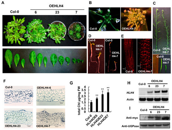 Overexpression of HLH4 causes dwarf and dark green phenotypes. (A) Phenotypes of whole plants and leaves of different HLH4 overexpression A. thaliana lines. (B) HLH4 overexpression lines showed abnormal flowers at the initial stage of flowering. (C) Siliques of HLH4 overexpression lines are shorter than those of wild-type plants. (D) Hypocotyls of HLH4 overexpression lines are shorter than wild-type (Col-0) plants grown under light or dark conditions, and cotyledons of HLH4 overexpression lines are unfolded in the dark. Bar = 1 mm. (E) Hypocotyl cells of HLH4 overexpression lines are shorter than those of wild-type plants. Seedlings were stained with propidium iodide and examined by confocal microscopy. Bar = 50 µm. (F) Leaf cross-sections of wild-type and different HLH4 overexpression lines. Bar = 50 µm. (G) Chlorophyll content of wild-type and different HLH4 overexpression lines. Data represent mean ± SD of three biological replicates with three technical replications (n = 9). Asterisks indicate significant differences (** p < 0.01). (H) Transcription levels of HLH4 in leaves of wild-type and different HLH4 overexpression lines. (I) protein expression levels of different HLH4 overexpression lines.