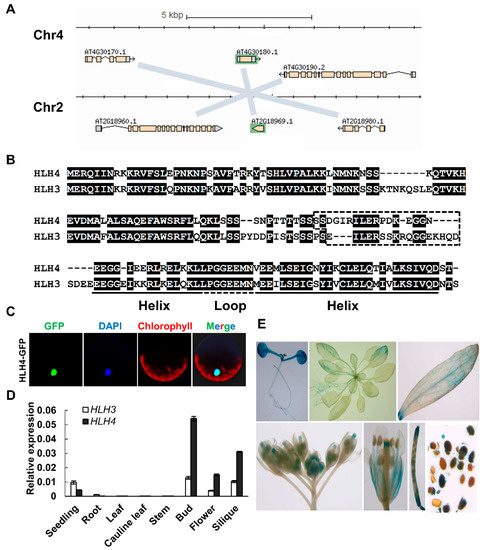 HLH4 is localized in the nucleus and is predominantly expressed in seedlings and reproductive organs. (A) Genome organization of HLH4 and synteny with its paralog HLH3 on A. thaliana chromosomes. (B) Protein sequence alignment of HLH4 and HLH3. Helix-loop-helix structure domains (https://www.predictprotein.org/, accessed on 21 March 2022) are indicated, and the dashed box represents hypothetical basic regions. (C) Subcellular localization of HLH4-GFP fusion protein in A. thaliana protoplasts. (D) RT-qPCR analysis of HLH4 expression from various tissues. Data represent mean ± SD of three biological replicates with three technical replications (n = 9). (E) In vivo analysis of the HLH4 expression pattern using proHLH4::GUS reporter lines.