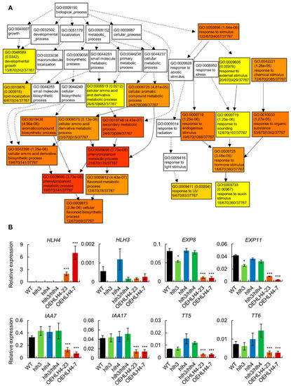 To investigate the transcriptional regulation governed by HLH4, we compared the transcriptome of the HLH4 overexpression line O23 (OEHLH4-23) and wild-type plants grown under normal conditions. Compared to wild-type, a total of 697 and 509 genes were downregulated and upregulated (|log2 fold change| > 2) in O23, respectively (Table S1). To investigate the possible biological processes that HLH4 involves, the differentially-expressed genes were used for gene ontology analysis. The results showed that the downregulated genes are significantly enriched in developmental growth, flavonoid biosynthesis, response to UV, and auxin stimulus (Figure 3A), suggesting HLH4 may be involved in the regulation of genes that function in these biological processes.