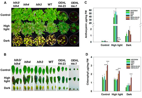 To confirm the data from the RNA-seq analysis, we detected the expression of HLH4 and HLH3 and selected several genes, including EXP8 and EXP11 (which are involved in cell elongation), IAA7 and IAA17 (involved in auxin and BR signaling), and TT5, TT6, MYB75, and TT3 (which are involved in flavonoid biosynthesis) for validation using RT-qPCR and RT-PCR (Figure 3B and Figure S3). HLH4 was highly expressed in OEHLH4-23 and OEHLH4-7 compared with WT and hlh3, hlh4 and hlh3hlh4, confirming the materials we used for RNA-seq. HLH3 seems slightly upregulated in hlh4, probably because the loss of HLH4 transcripts requires activated HLH3 to compensate for their function. Consistent with the RNA-seq data, all the genes were significantly downregulated in different HLH4 overexpression lines (Figure 3B and Figure S3), while DECREASE WAX BIOSYNTHESIS (Dewax) and KELCH REPEAT F-BOX (KFB20) were upregulated. However, expression of these genes was not significantly changed in hlh3, hlh4 and hlh3hlh4 mutants (Figure 3B). Because many downregulated genes in HLH4 overexpression lines are involved in flavonoid biosynthesis and response to UV, we suppose that HLH4 may negatively regulate flavonoid biosynthesis. Light stress induces the accumulation of anthocyanin, a type of flavonoid, to protect the photosynthetic apparatus against excess light [43]. Therefore, plants were treated with high-light or dark conditions to analyse the influence of overexpression of HLH4 in anthocyanin accumulation. However, no significant differences in anthocyanin accumulation were observed among wild-type, HLH4 overexpression lines, hlh3, hlh4, and hlh3hlh4 mutants under normal and dark conditions (Figure 4A). Light stress strongly induced anthocyanin accumulation in wild-type, hlh3, hlh4, and hlh3hlh4 plants; however, in HLH4 overexpression lines, anthocyanins did not accumulate (Figure 4C). Anthocyanin content has a negative relation with chlorophyll in colorful tree species [44]. Therefore, the chlorophyll content was determined in treated A. thaliana plants. Consistent with the observations in colorful tree species, HLH4 overexpression lines contain more chlorophyll than wild-type, hlh3, hlh4, and hlh3hlh4 plants under all tested conditions (Figure 4D).