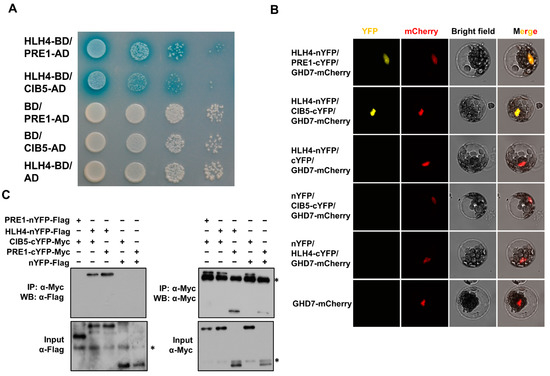 HLH4 interacts with CIB1 and PRE1. Yeast two hybrid (A), BiFC (B) and protoplast co-immunoprecipitation (Co-IP) (C) assays indicate that HLH4 interacts with CIB1 and PRE1. The GHD7-mCherry plasmid was used as a nuclear marker. Asterisk * in (C) represents unspecific protein bands.