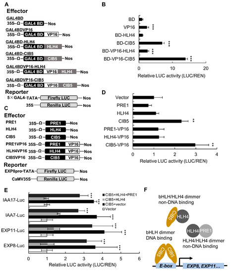 We next performed transient expression assays in which a 2 kb EXP8 promoter sequence containing thirteen E-box motifs was placed upstream of the LUC reporter gene and used as a reporter. EXP8 was reported to be a downstream target gene of CIB5, and CIB5 specifically binds the G-box-like cis-elements within the EXP8 promoter [20]. Our results show that the activity of the EXP8-LUC reporter gene was significantly upregulated when pro35S-CIB5 or pro35S-CIB5-VP16 were coexpressed with the EXP8-LUC reporter gene (Figure 6C,D),which confirms that CIB5 binds to the EXP8 promoter. On the contrary, the reporter gene was not activated when pro35S:HLH4, pro35S-HLH4-VP16, pro35S-PRE1 and pro35S-PRE1-VP16 were coexpressed with the EXP8-LUC reporter, indicating that HLH4 and PRE1 do not bind to DNA.