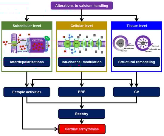 Calcium plays a major role in both excitation and contraction of atrial and ventricular cardiomyocytes. The influx of calcium via L-type calcium channel (LTCC) mediates a much larger calcium release from the sarcoplasmic reticulum (SR) to the cytoplasm through calcium-induced calcium release (CICR), which initiates myriads of processes within a cardiomyocyte, including the activation of calcium-dependent signaling molecules (e.g., calmodulin, calcineurin, calpain, etc.), transmembrane ion channels, calcium-handling proteins and contractile machineries of the cardiomyocyte. During diastole, calcium ions are partly stored back in the SR and partly extruded from the cell via the sodium-calcium exchanger (NCX). Under pathological conditions, these complex processes can be disrupted, creating substrates and triggers for cardiac arrhythmias []. There are three major calcium-dependent arrhythmogenic mechanisms: initiation of afterdepolarizations (i.e., early afterdepolarizations [EADs] and delayed afterdepolarizations [DADs] leading to triggered activity [TA]), direct and indirect ion-channel modulation, and the promotion of structural remodeling []. Those pathological processes can modify action potential (AP) properties (e.g., action potential duration [APD], resting membrane potential [RMP] and effective refractory period [ERP]) and cell-to-cell coupling, further altering tissue-level conduction velocity. In turn, these electrophysiological alterations may promote ectopic activity, reentrant waves and cardiac arrhythmias (Figure 1). In addition, in sinoatrial (SA) node cells, calcium handling strongly modulates pacemaking activity through a calcium clock involving spontaneous SR calcium leak, which in turn activates NCX to promote diastolic depolarization and automaticity. Accordingly, calcium-handling abnormalities may also promote sinus node dysfunction [,,].