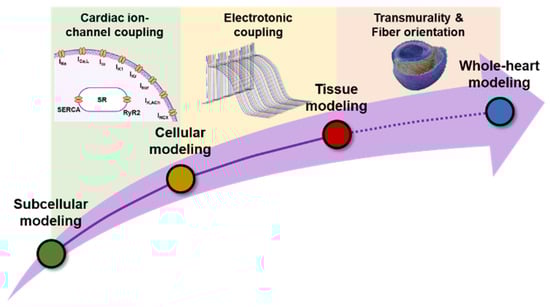 Schematic illustration of multiscale computational modeling. To integrate individual modeling scales into a holistic model, a subcellular model of cardiomyocyte calcium handling is coupled with other cardiac ion channels to form a cellular model. Subsequently, cell models propagate the electrical impulse through gap junctions to form a 1-dimensional strand or 2-dimensional tissue model. At the organ level, different types of tissues, representing different regions and layers of the heart (e.g., epicardium, mid-myocardium, endocardium, Purkinje fibers, etc.) are combined with fiber orientation and structural remodeling.