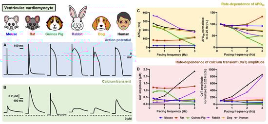 Interspecies difference of AP and calcium transient (CaT) in several computational models of ventricular cardiomyocytes. All simulations were carried out in Myokit []. (A,B) The AP and CaT were stimulated using the default setting of each model at a 1 Hz pacing frequency (basic cycle length [BCL] of 1000 ms) and quasi-steady-state was obtained following 1000 beats of pre-pacing. (C,D) The rate dependence of APD90 and CaT. Mouse model = Bondarenko et al. (2004; []), Rat model = Niederer et al. (2007; []), Guinea-Pig model = Noble et al. (1998; []), Rabbit model = Mahajan et al. (2008; []), Dog model = Decker et al. (2009; []) and Human model = O’Hara et al. (epicardial; 2011; []). By default, the Bondarenko and Niederer models were set at room temperature (22–25 °C), whereas the rest of the models were set at body temperature (±37 °C).