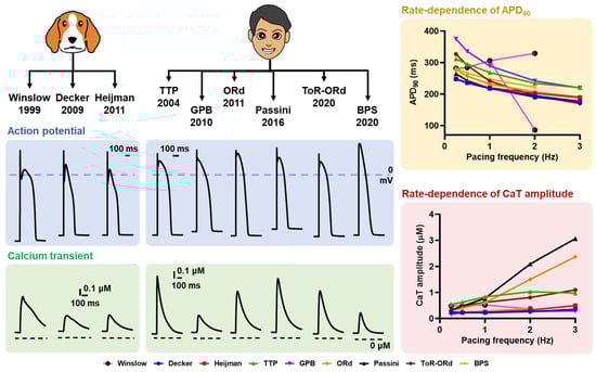 Comparison of APD and calcium transient (CaT) between several canine and human ventricular cardiomyocyte models. The AP and CaT were stimulated using the default setting of each model at a 1 Hz pacing frequency (basic cycle length [BCL] of 1000 ms; the left panels) and quasi-steady-state was obtained following 1000 beats of pre-pacing. (BPS model = []; Decker model = []; GPB model = []; Heijman model = []; ORd model = []; Passini model = []; ToR-ORd model = []; TTP model = []; Winslow model = []).