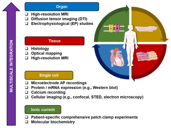 A schematic illustration summarizing multiscale integration of patient-specific data. The “bottom-up” approach starts from the ionic current/molecular level up to the organ level. At each scale, the acquired data can be utilized as an input for computational modeling. Ultimately, a personalized 3-dimensional computational model can be developed and used for patient-specific arrhythmia research. (MRI = Magnetic Resonance Imaging; mRNA = messenger Ribonucleic acid; STED = Stimulated Emission Depletion).