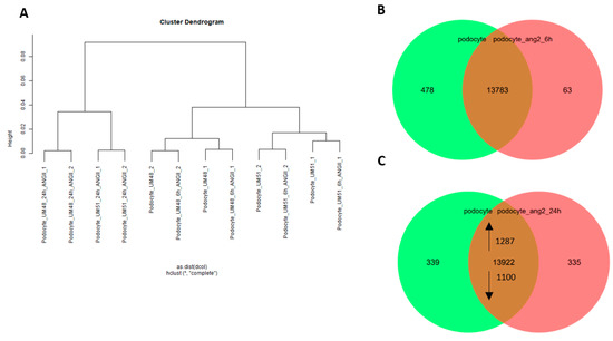 Comparative transcriptome and Gene Ontology analysis of untreated podocytes UM48 and UM51 and treated with angiotensin II for 6 h and 24 h. Podocytes were treated with ANGII (100 μM) for 6 h and 24 h. The hierarchical cluster dendrogram revealed 2 distinct clusters—24 h treated and 6 h treated and untreated cells as a cluster. (A). Expressed genes (det-p < 0.05) in podocytes and after ANGII treatment are compared by Venn diagrams after 6 h (B) and 24 h (C), revealing unique and overlapping expression patterns. The most over-represented GO-BP terms (13922 genes) common in either condition are shown in (D) after 6 h of treatment and (E) after 24 h. The terms include locomotion, growth, immune system process, response to stimulus biological adhesion, metabolic process, and cell proliferation for the treated podocytes. The 10 most over-represented GO-BP terms in the upregulated (1287) and downregulated (1100) genes in podocytes treated for 24 h with ANGII in comparison with untreated cells are shown in (F). The upregulated genes are associated with cell cycle, DNA repair, cell cycle phase transition, methylation, and regulation of cellular response to stress, while downregulated genes are associated with regulation of cell adhesion, cell junction organization, axonogenesis, actin cytoskeleton organization, and tissue and gland morphogenesis (G).