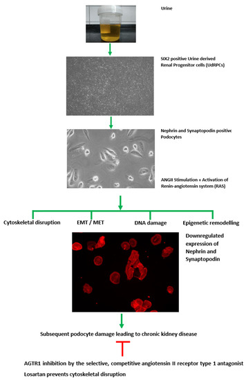 Graphical summary of this study. SIX2-positive renal progenitor cells were isolated directly from human urine and cultured in proliferation medium. UdRPCs differentiated into podocytes, by low density cultivation in advanced RPMI medium supplemented with 30 μM retinoic acid. Stimulation with 100 μM ANGII results in cytoskeletal remodeling. Furthermore, the transcriptome revealed altered expression of genes associated with epigenetic remodeling, DNA damage response, EMT, and MET. ANGII activated the renin–angiotensin system, resulting in podocyte damage and loss and ultimately leading to chronic kidney disease.
