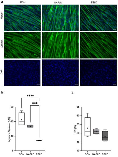 A one-way ANOVA revealed a significant main effect between groups (p < 0.001, 2 = 0.86, F = 28.81) (Figure 1b, Supplementary Figure S1). Myotube diameter was significantly reduced in response to conditioning with serum from ESLD patients compared with CON (45%, p < 0.0001, d = 5.9) and NAFLD (35%, p < 0.002, d = 17.4) patients. Myotube diameter was numerically lower in myotubes conditioned with serum from NAFLD compared with CON patients, but did not reach significance (15%, p = 0.08, d = 1.7). No significant difference in NFI was identified between experimental groups (Figure 1c, Supplementary Figure S1).