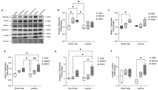 Markers of catabolic signaling are elevated within myotubes treated with serum from ESLD patients for 4 h and a 30 min treatment with leucine. Myotubes were treated with ex vivo human serum from age-matched control (CON), non-alcoholic fatty liver disease (NAFLD) and end stage liver disease (ESLD) patients for 4-h, with and without a 30-min treatment with 5 mM leucine. (a) Representative western blot images of catabolic signaling markers, (b) myostatin, (c) MAFbx, (d) MuRF-1, (e) caspase-3, (f) LC3A/B. Data are expressed as fold change in comparison to the CON. Data are expressed as the mean (cross), median (central horizontal line), 25th and 75th percentiles (box) and the minimum and maximum values (vertical lines), with n = 4 per group and each data point corresponding to the average of 3 technical repeats. * p < 0.05, ** p < 0.01.