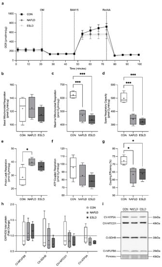 Serum from NAFLD and ESLD patients induces impairments in mitochondrial respiration, despite no changes in markers of mitochondrial protein content. (a) Raw trace of oxygen consumption rate (OCR) for myotubes treated with ex vivo serum from non-alcoholic fatty liver disease (NAFLD), end stage liver disease (ESLD) and age-matched controls (CON), (b) basal mitochondrial respiration was assessed prior to the addition of oligomycin (OM), an ATP synthase inhibitor and represents the energetic demand of the cell in baseline conditions, (c) maximal mitochondrial respiration was calculated after the addition of the uncoupler BAM-15, (d) spare respiratory capacity indicates the ability of a cell to respond to an increase in energetic demand (e) proton leak respiration represents the portion of basal respiration not associated with ATP production (f) ATP coupled respiration was calculated upon the addition of OM, (g) coupling efficiency was calculated as the percentage of respiration accounted for by ATP production, (h) quantification of OXPHOS/total protein, (i) representative western blot of OXPHOS. Respirometry data were normalized to protein content. Western blot data are expressed as fold change in comparison to CON. Data are expressed as the mean (cross), median (central horizontal line), 25th and 75th percentiles (box) and the minimum and maximum values (vertical lines), with n = 4 per group and each data point corresponding to the average of 3 technical repeats. *** p < 0.001, * p < 0.05.