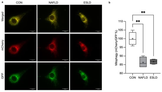 Mitophagy was assessed using a mitophagy reporter cell line (mitoQC) in C2C12 skeletal muscle cells, in which C2C12s express a stable functional insert tandem mCherry-GFP tag, which is fused to the mitochondrial targeting sequence of FIS1 (residues 101–152) []. Under basal conditions, the mitochondria fluoresce both red (mCherry) and green (GFP), which when merged appear gold in color. However, mitophagy induces an acidic environment within the lysosomes which quench the signal of GFP, but not mCherry []. Consequently, an increase in mCherry signal, thus the mCherry/GFP ratio measured by the intensity of fluorescence, occurs within the mitochondrial network indicating mitophagy. A one-way ANOVA revealed a significant main effect between groups for the analysis of mCherry/GFP (p < 0.001, 2 = 0.86, F = 27.19) (Figure 5a). Specifically, in comparison to myoblasts treated with serum from CON there was a significant reduction in the level of mitophagy, as shown by a decrease in the ratio of mCherry/GFP reported in myoblasts treated with serum from NAFLD (14%, p < 0.001, d = 3.9) and ESLD (13%, p < 0.001, d = 5.1) patients. No significant difference in mitophagy was evident between myotubes treated with serum from NAFLD and ESLD patients.