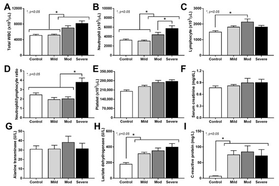 Characteristics of patients with COVID-19 in different severities—mild (n = 27), moderate (n = 28), and severe (n = 20), versus healthy control (n = 15), as indicated by total peripheral white blood cell count (WBC) (A), blood neutrophils and lymphocytes (B,C), neutrophil/lymphocyte ratio (D), platelet count (E), serum creatinine (F), alanine transaminase (ALT) (G), lactate dehydrogenase (LDH) (H), and C-reactive protein (CRP) (I)—are demonstrated. *—p < 0.05 between the indicated groups as determined by ANOVA with Tukey’s analysis.