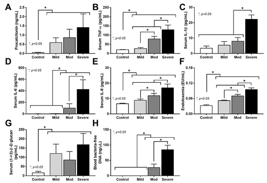 Characteristics of patients with COVID-19 in different severities—mild (n = 27), moderate (n = 28), and severe (n = 20), versus healthy control (n = 15), as indicated by procalcitonin (A), serum cytokines (TNF-α, IL-1β, IL-6, and IL-8) (B–E), endotoxemia (F), serum (1→3)-β-D-glucan (G), and blood-bacteria-free DNA (H)—are demonstrated. *—p < 0.05 between the indicated groups as determined by ANOVA with Tukey’s analysis.