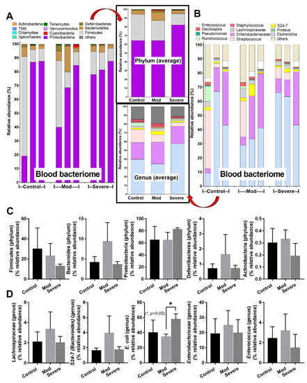 Blood microbiome analysis (blood bacteriome) from samples of healthy control (Control) and COVID-19 infection in moderate (Mod) and severe (Severe) conditions, as indicated by the phylum level analysis (with average value) (A), genus-level analysis, and average value (B). Graph presentation in phylum (C) and genus (D) analysis are demonstrated (n = 3/group). *—p < 0.05 between the indicated groups using one-way ANOVA with Tukey’s analysis.
