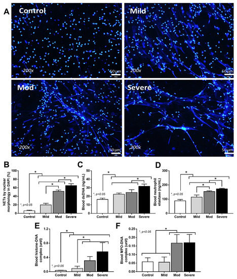Neutrophil extracellular traps (NETs) of patients with COVID-19 in different severities—mild (n = 27), moderate (n = 28), and severe (n = 20), versus healthy control (n = 15), as indicated by morphology of DAPI nuclear staining with the representative pictures (A,B), blood dsDNA (C), blood neutrophil elastase (D), histone–DNA complex (E), and myeloperoxidase (MPO)–DNA complex (F)—are demonstrated. * p < 0.05 between the indicated groups as determined by ANOVA with Tukey’s analysis.